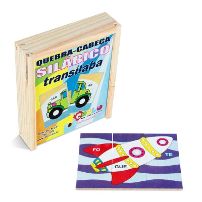 Descritivo detalhado: Confeccionado em M.D.F. composto por 16 peças, formando 6 bases ilustradas de 15 x 12 cm, pintadas e serigrafadas em policromia ultravioleta atóxica. Ilustrações de diferentes transportes (navio, trem, foguete, carro, submarino e avião), com cortes diferenciados, separando objetos em partes com suas respectivas sílabas. Observação: as sílabas que não se separam, exemplo trem, a base é inteira. Embalagem: Caixa de madeira com tampa serigrafada medindo 18 x 15 x 4 cm. Lacrada com película de P.V.C. encolhível.